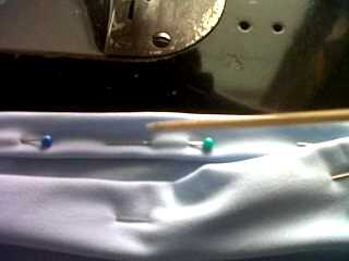 karet. Jahit lurus, berhenti sejenak, Tarik karetnya, lalu jahit lagi. Pada
